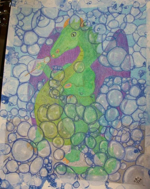 GRAMMY NOTES: This started out as a whimsical sketch of a dragon roasting a marshmallow with his fiery breath. Then, I saw this fun technique for blowing bubbles with watered down paint with a bit of dish detergent mixed in. When the bubbles are the right size, you lay the paper on them and they pop to make painted bubble shapes on the paper. I thought, “What fun! I’ll change my dragon so he’s blowing bubbles instead of fire! And, of course, being a dragon who does everything BIG, there will be lots and lots and lots of bubbles.” Making the bubbles was very fun … but they were blue and I’d drawn the dragon with a blue pencil so … net result, I almost lost the dragon drawing in all the bubbles. LOL