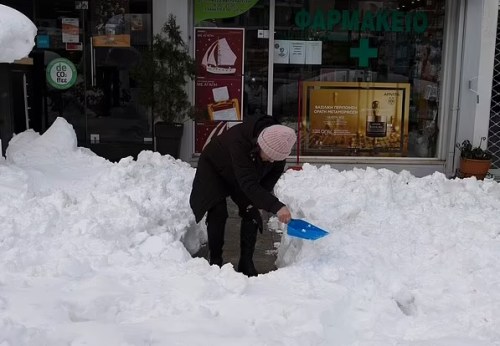 The photo above is labeled: “GREECE: A shop owner shovels a path through to a drug store in the Cholargos suburb of Athens after a severe blizzard caused up to 31 ins of snow to fall in parts of the country.” I chose it because it typifies the problem these folks are having with this rare snow event. For those of us who live with snowy winters, a blizzard slows us down a bit. But we all have snow tires, shovels, snowblowers, winter clothing, etc. and our municipalities have lots of snow plows and salt trucks that they mobilize as soon as necessary. We also know how to drive in the snow. These folks have none of that. Look at this poor shop owner, trying bare-handed to clear her sidewalk with a dust pan!
