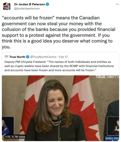 - https://twitchy.com/sarahd-313035/2022/02/17/canadian-deputy-pm-chrystia-freeland-says-those-who-donated-to-freedomconvoy-will-have-their-accounts-frozen-if-they-havent-already-video/