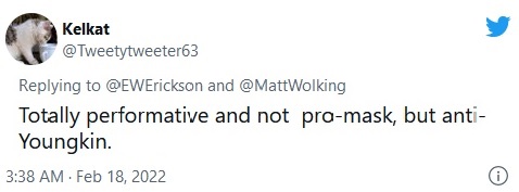 MASK THEATER: CLICK https://twitter.com/EWErickson/status/1494496968227364864 [:45] to see two Virginia Dems realize the camera is on them.