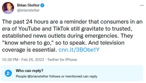JERKNALIST: When CNN’s Brian Stelter tweeted about how good the invasion of Ukraine was going to be for his ratings, he got dragged. So, he blocked replies.