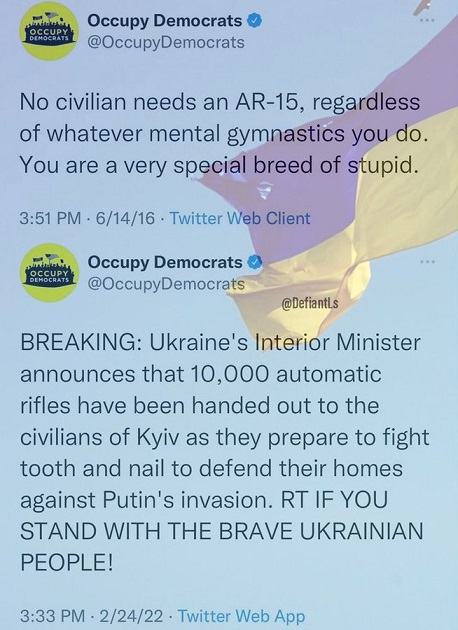 2A: Occupy Democrats has suddenly decided that having an armed citizenry is a good thing. Their follow up tweets included, “BREAKING: A pizza shop owner in Kyiv is giving out free pizzas to any Ukrainian who shows that they have a gun to fight the Russian invaders with. RT IF YOU STAND WITH UKRAINE!” and “If you’re an American who supports the Kyiv pizza shop owner who is giving free food to any Ukrainian who shows they have a gun to fight the Russian invaders — please RT and follow our account for the latest breaking Ukraine news.”