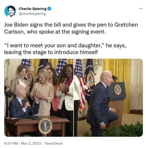 CREEPY UNCLE JOE: Right after signing into a new law designed to help victims of sexual harassment and assault seek justice, Captain Sniff jumped over the greenery to meet Gretchen Carlson’s very attractive teen-aged children. I couldn’t find any photos of how their meeting went.