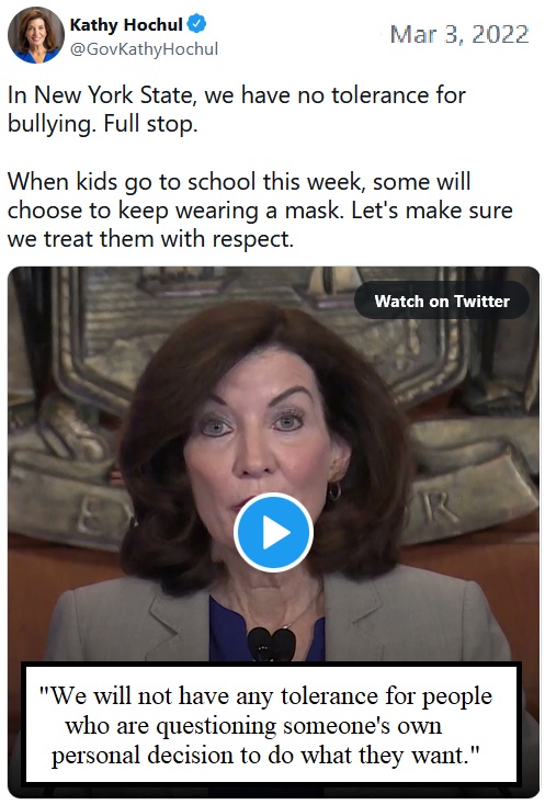 MASKS: CLICK https://twitter.com/GovKathyHochul/status/1499415332821295122 [:30] to hear an absolutely stunning display of libtard hypocrisy from my idiotic governor. She was obviously trying to dunk of Ron DeSantis telling a group of students to please take off their masks … “but you can keep them on if you want.”
