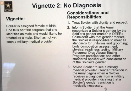MILITARY: All Army personnel, from soldiers to commanders and supervisors, are required to participate in gender sensitivity training before Sept. 30, 2022. The graphic is one of the slides from the presentation. I am definitely not going to ask my kids how they feel about this, cuz they try hard not to use coarse language around me and I don’t want to make it harder for them.