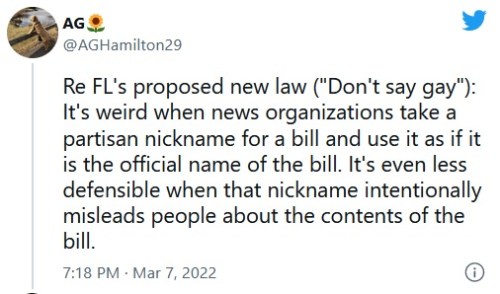 The NPR report is particularly egregious. Not only does the headline call it the “Don’t Say Gay” bill, but in the text of the article, it refers to “the so-called Parental Rights in Education” bill. Wait, wut? “Parental Rights in Education” is literally the bill’s official title!