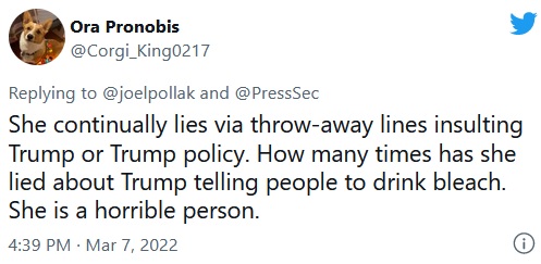 PSAKI: CLICK https://twitter.com/townhallcom/status/1500931378455760901 [:24] to hear Lying Jen say Trump wants Iran to have nukes. It’s interesting how they keep talking about a president who has been out of office for more than a year.