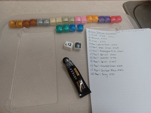 GRAMMY NOTES: Mama and I are filling half-pans with the watercolors and gouaches that we each have that the other doesn’t. Both of these types of paint can be reactivated with water and used with no loss of quality. We’re having so much fun!