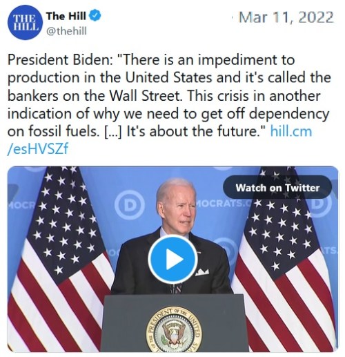 - https://twitchy.com/sarahd-313035/2022/03/11/joe-biden-changes-his-story-again-now-says-the-bankers-on-wall-street-are-preventing-domestic-energy-production-video/