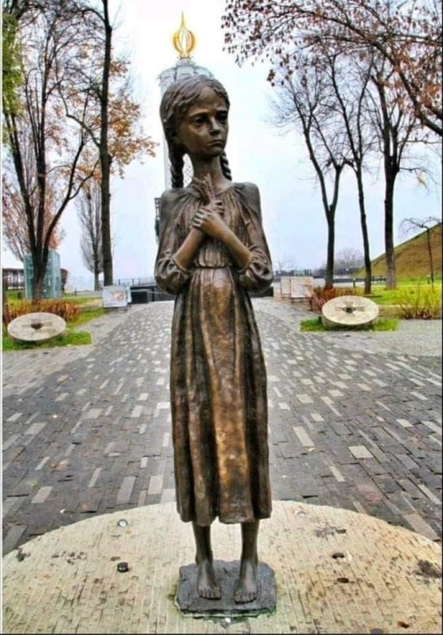 At the entrance to the Kiev Memorial Park, there is a sculpture of a very thin girl with an extremely sad look, holding several classes of wheat in her hands. Behind her, you can see the Candle of Remembrance monument that marks the Holodomor.