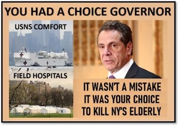 NYS: Comproller DiNapoli’s new 58-page audit report says then-Gov’ Cuomo’s Dept. of Health deliberately undercounted ‘rona nursing home deaths by as much as 50% to protect Cuomo’s rep as the national COVID Hero. What Cuomo really was is the Grim Reaper. Despite knowing the virus was especially lethal to old folks and the state had multiple, unused resources (like the Navy hospital ship), Cuomo ordered nursing homes to accept COVID-positive patients. The fact that some of them had kept the virus out and/or had no means to quarantine new patients didn’t matter. The state also helpfully sent body bags along with the infected patients, which nursing homes quickly filled with the dead.