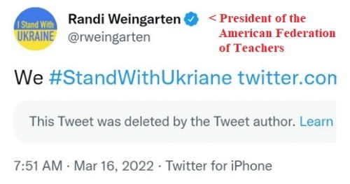 TEACHER’S UNION: For the second time this week, Weingarten sent out (then deleted) a factually incorrect tweet about Ukraine. In the first one, she had the Ukrainian flag upside down.