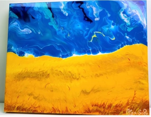 UKRAINE: Painting by Olga Soby, acrylic pour artist, YouTuber, and immigrant from Ukraine – According to the Newsmax story linked here, Russian soldiers want to go home so badly that some are seeking out Ukrainian ammunition so they can shoot themselves and get a medical discharge.