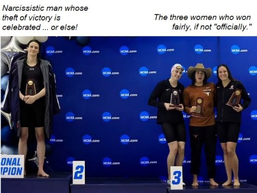 WOMEN’S SPORTS: An unidentified mother of an Ivy League NCAA swimmer said female swimmers are “frightened” by the prospect of professional, personal, and academic reprisals if they speak out about the intrusion of biological men, like “Lia” Thomas, into their competitions and locker rooms. Thomas reportedly still has his man parts and is sexually attracted to women.