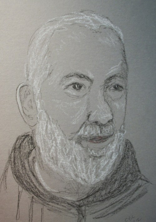 GRAMMY NOTES: I have been doing quick portraits with charcoal and white pastel pencils on gray paper. No grids, no tracing, just eyeball practice. These are great fun, but so far, none has looked like the reference photos. This one came the closest, but I think he looks more like Alec Guinness as Obi Wan Kenobi than he does like St. Padre Pio, the guy I was trying to draw.