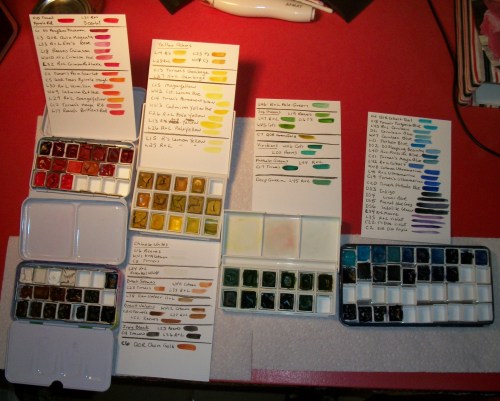 GRAMMY NOTES: Mama Buzz’s contribution to my watercolor collection arrived yesterday and I spent many happy hours experimenting, swatching, and sorting them by hue groups into my little tins. Maybe today, I’ll actually paint something. 🙂