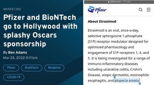 Drumroll Please……. Pfiz€r JUST announced success of a new drug that is said to treat autoimmunity related illnesses including alopecia. They’re in phase 3. The announcement came just 2 days post Oscars. Well at least there’s no conflict of interest. It’s not like they also sell a vaccine with the side effects of aut0immunity including alopecia. And it’s not like they sponsored the Oscars or anything. Because that would just be £ucking ridiculous. No way we’d let this all slide.”