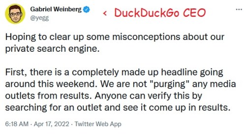 DUCKDUCKGO: DuckDuckGo CEO Gabriel Weinberg said that the search engine downranks spam, but does not rank news lower based on a ‘political agenda.’