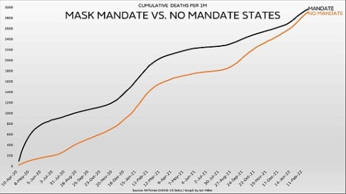 MANDATES: The black line on the graph shows the weekly rate of COVID-19 cases in all the states with mask mandates that week, while the orange line shows the rate in all the states without mandates. The Daily Case Rates graph shows the same lack of mask effectiveness.
