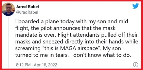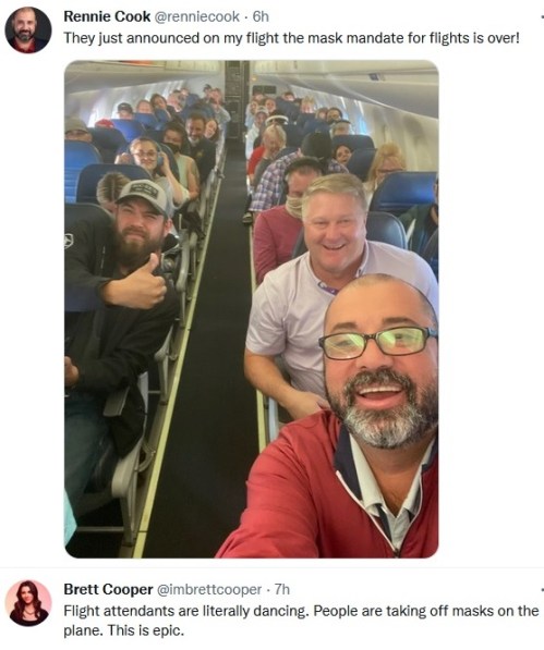 Also, “Just landed after a long flight on United, during which a flight attendant announced the mask mandate had been struck down & put up a sign. When we got off, the pilots were smiling. We told them it was wonderful to see their faces again. Majority of passengers were also thrilled.” – Katie Pavlich tweet