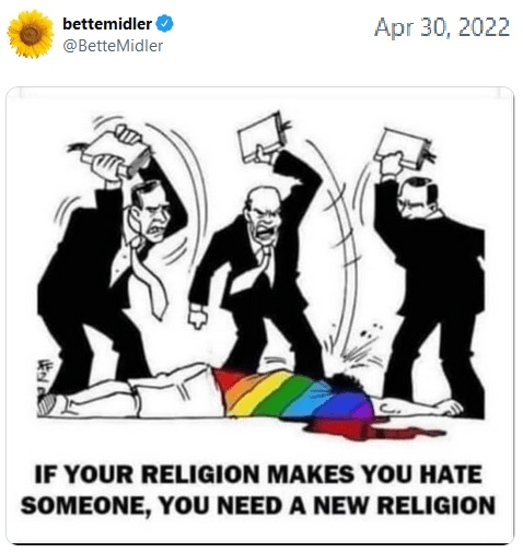BETTE MIDLER: She feels free to slander Christians, because our religious leader told us to “turn the other cheek.” She wouldn’t dare actually name or depict the world religion that actually executes people for being gay, because, you know, those people get really nasty towards people who slander (by which I mean tell the truth) about their religious leader’s teachings.