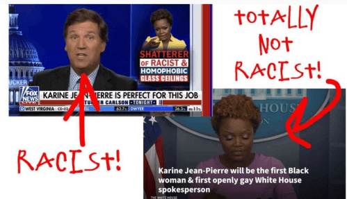 HUFFPO: HuffPost attacks Tucker Carlson for fixating on the race and sexual orientation of the new White House Spox, Karine Jean-Pierre, by fixating on her being black and gay.