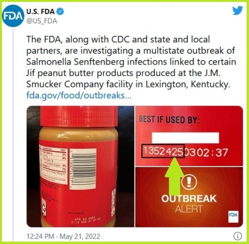 PSA: Lots of Jif peanut butter (smooth and crunchy) that end in 425 are being recalled for possible salmonella contamination. Peanut butter has a two year shelf life, so if you ever buy Jif, check your pantries. If you have used an affected jar, wash and sanitize surfaces and utensils that could have touched the peanut butter.
