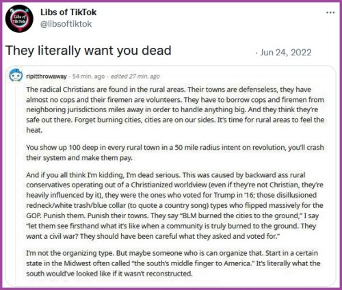 - https://twitchy.com/brettt-3136/2022/06/25/redditor-whos-not-the-organizing-type-wants-rural-areas-to-see-what-its-like-when-a-community-is-burned-to-the-ground/