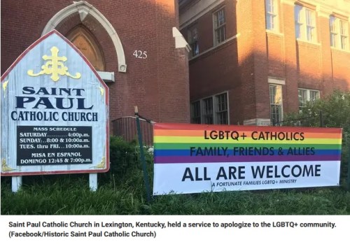 CATHOLIC: Saint Paul Catholic Church in Lexington, KY, held a service to apologize for “the Church’s lack of respect, compassion, and sensitivity and for unjust discrimination” toward the sinful, sexual perversion community. What’s next … apologies to the adulterous and pedophilic communities?