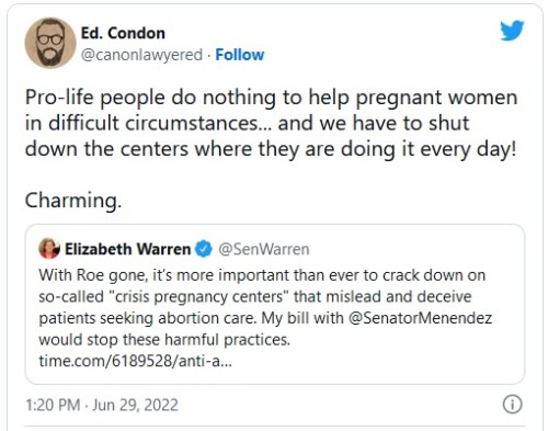 - https://twitchy.com/sarahd-313035/2022/06/29/elizabeth-warren-announces-that-she-and-bob-menendez-are-taking-steps-to-stop-pro-lifers-from-saving-babies-and-helping-pregnant-women/