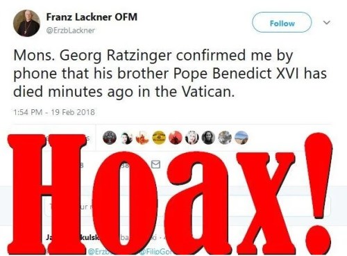 CATHOLIC: On Tuesday morning, a fake Twitter account started a rumor that Pope Benedict XVI had passed away. It’s not true. Apparently, the same thing happened in 2018.