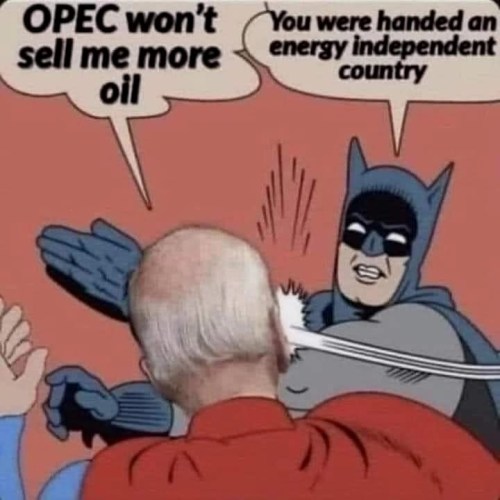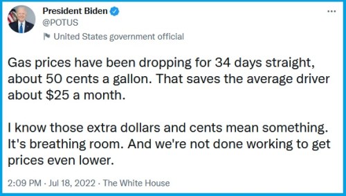 FAUXTUS: When prices were going up, Slow Joe said he couldn’t do anything about it. It was Putin’s fault and those eeeevil gas station owners who were doing it. Now they’re down a smitch (most likely because he raided our wartime reserve again), he’s spiking the football. Plus, you know, we’re not “saving” $25 a month on gas; we’re paying hundreds more per month than we did when Trump was in office. But, phew, no more mean tweets, right?