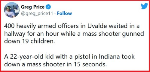 Dicken killed the shooter within 15 second of the first shot. And of the ten bullets Dicken fired, eight hit the target. From 40 feet away! To my mind, the most notable fact is that Indiana’s new constitutional carry law only went into effect on July 1, 2022 … just 17 days before the shooting.