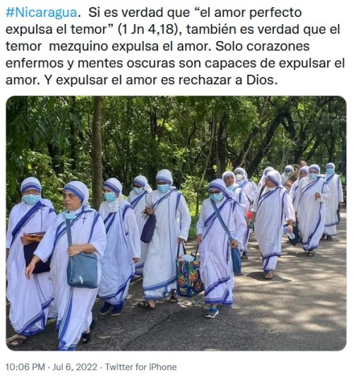 CATHOLIC: Eighteen nuns from the Missionaries of Charity – the order founded by Mother Teresa – were escorted out of Nicaragua by police after the Nicaraguan Parliament revoked their legal status on June 28. The order of sisters has been operating in the country since 1998, running a home for abused and abandoned girls, a children’s nursery, and a nursing home. The move is apparently retribution by President Daniel Ortega whose human rights abuses the Catholic Church has condemned.