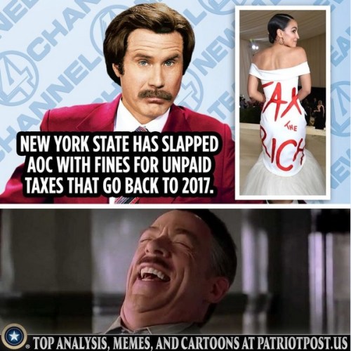 AOC: In 2012, AOC founded Brook Avenue Press, a publishing house that sought designers, artists, and writers from urban areas to help paint The Bronx in a positive way in children’s stories. The company dissolved four years later. In 2017, the New York Tax Department filed a warrant against the defunct business for $1,618.36 in unpaid taxes. She hasn’t done anything about it. With fines and interest, the balance is now $2,088.78, which I’m guessing is a lot less than that “Tax the Rich” designer dress and ticket to the Met gala cost. She says she doesn’t have to pay it, because it was “issued in error.” Last I heard, she hasn’t paid her school loans either. Were they also “issued in error”? Or does she just think she’s better than the unwashed masses she presumes to rule?