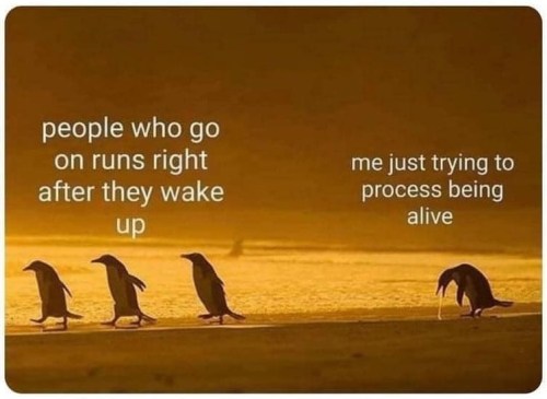 That last pic – I’m not as bad as the puking penguin, but closer to that than to the runners. Or was. Now our new puppy wakes up at first daylight and pulls me out the door for a walk. Only after that do I get to make the coffee! This was not my morning routine pre-puppy!