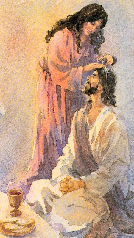 The second anointing, which occurred at a dinner in Bethany at the beginning of Passion Week, is recounted in Matthew 26:6-13, Mark 14:3-9, and John 12:1-8. Neither Matthew nor Mark identify the woman, who broke an alabaster jar and poured the genuine spikenard within on to Jesus’ head. Spikenard is an expensive essential oil that was used for perfumes, for medicinal ointments, and in religious ceremonies.