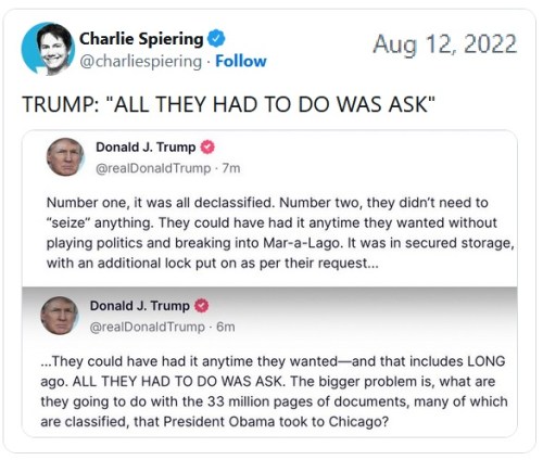 TRUMP: CLICK https://twitter.com/Breaking911/status/1558275061060194314 [:55] to hear the statement from Trump’s lawyer that Trump had a standing order in place that any documents he removed from the Oval Office were automatically deemed declassified.