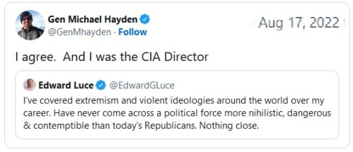 Journalist Matt Taibbi responded to Hayden’s tweet, “So ‘today’s Republicans’ are more dangerous than ISIS, Al-Qaeda, etc? Given that you used drones to assassinate members of the latter groups, do you think that’s indicated here?