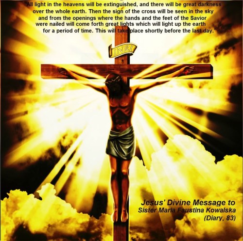 END TIMES PROPHECY: St. Faustina recorded the following message from Jesus – “Before the day of justice arrives, there will be given to people a sign in the heavens of this sort: All light in the heavens will be extinguished, and there will be great darkness over the whole earth. Then the sign of the cross will be seen in the sky and from the openings of the hands and the feet of the Savior were nailed will come forth great lights which will light up the earth for a period of time.”