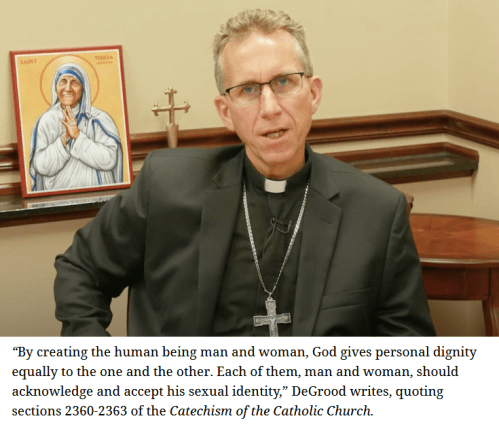 DeGrood’s policy bans “those who choose to live a transgender lifestyle publicly and declare such his/her intent in either word or action” from serving in any official capacity in Mass, and also from carrying out “employed ministry on behalf of any parish, parochial school, or diocesan ministries.”