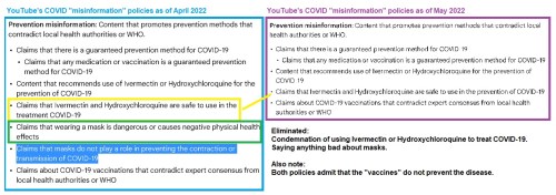 YOUTUBE: My, how things have changed. A whole lot of people got banned, suspended, and/or demonetized for saying masks don’t work or masks cause problems or ivermectin/hydroxy are effective. I am not holding my breath waiting on YT to apologize.