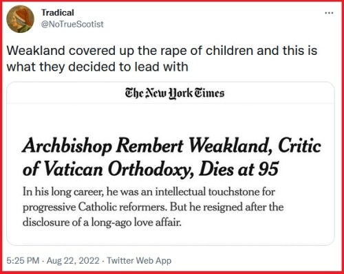 Since the news of Weakland’s passing, liberal Catholics have fondly eulogized the late, disgraced prelate, despite his abominable record on all fronts. The Jesuit magazine America called him “a leading Catholic intellectual who pushed for social justice and increased power for women in the church.” The New York Times’ even more effusive obituary dedicated just two lines to Weakland’s failures to protect children and cited the bishop’s farcical claim that the Vatican was to blame for Milwaukee’s abuse issues.
