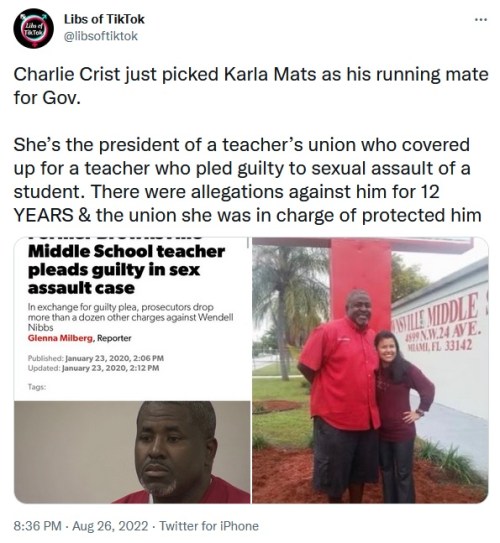 Christina Pushaw tweeted that, as soon as Karla became Charlie Crist’s running mate, the Florida legacy media moved to protect her. Because, of course, “good” people like Crist and Hernandez totes need to have their scummy pasts buried by their partisan bffs.