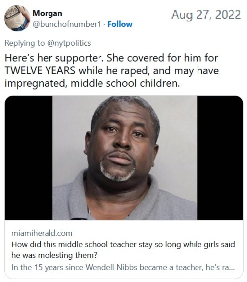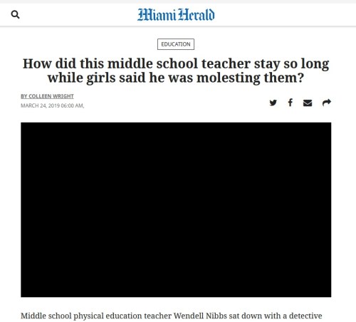 Most of the stories about Nibbs are behind a Miami Herald paywall, so I can’t get at any more details. But what I can see is fishy as hell. In all, nine girls came forward to accuse Nibbs of sexual behavior dating back to 2004, but his first arrest didn’t happen until 2017 when he apparently resigned from his job (or was fired, the stories differ). But it appears he did not go to jail. He was arrested again in 2019 and was finally convicted and put behind bars in 2020.