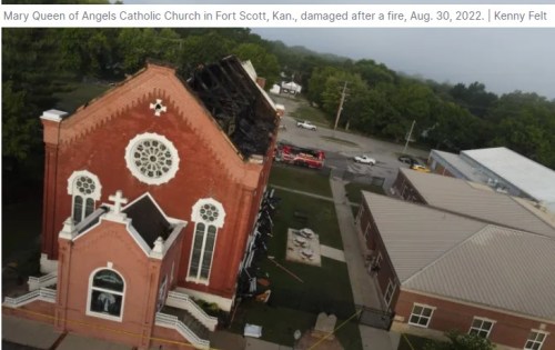 CATHOLIC: This historic 1800s church suffered extensive damage, including total loss of the roof. However, the altar, a crucifix, and multiple statues appear largely untouched.