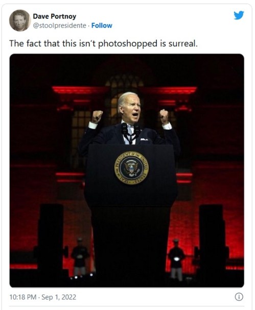 FAUXTUS: “Everytime I think Biden and crew can’t be dumber they outdo themselves. Seriously who gives a speech warning people about how dangerous Republicans are to Democracy while having a background that looks like the Soviet Union and Hitler had a baby?” – Dave Portnoy