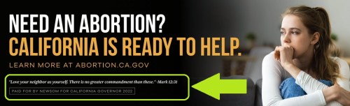 CALIFORNICATION: CINO Gov. Newsom is using taxpayer funds to encourage women in seven pro-life states to come to Cali to kill their unborn babies. Even more vile, the billboards feature the words of Jesus Christ to promote the idea that ending a pregnancy is a holy act.