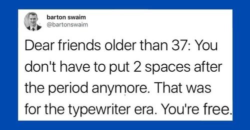 GRAMMY NOTES: Easier said than done for us old folks who learned to type back in the olden days! The lessons drilled into us by a stern-faced typing teacher wielding the dreaded Red Pen of Doom are not so easily dismissed. Add to that the fact that Some of us learned on MANUAL typewriters. Do you have any idea how much oomph it took to get those keys to not only strike, but also to advance the carriage?! That’s a lot of muscle memory to overcome. And I’ll thank you for noticing that I did not use a period double space in this comment. (Checks final claim for the third time … yup, all good.)
