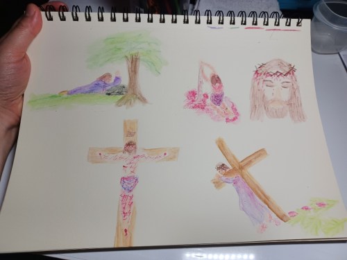 GRAMMY NOTES: Mama Buzz likes to do her rosary with Angelina (link below). On Tuesday, she felt the urge to paint while doing the Sorrowful Mysteries. I love it.